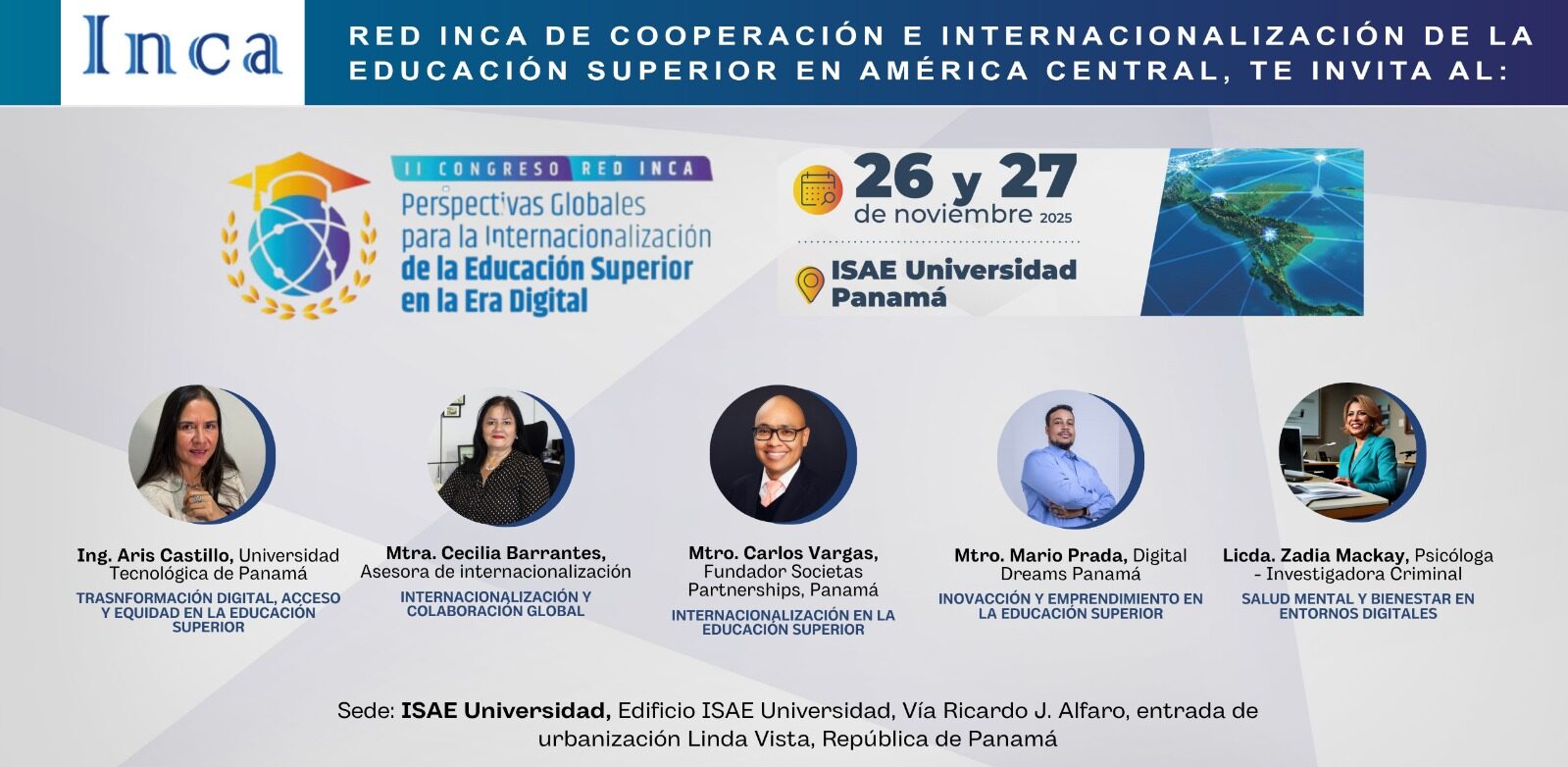 La Red INCA de Cooperación e Internacionalización de la Educación Superior en América Central anuncia la realización del II Congreso RED INCA, bajo el tema «Perspectivas Globales para la Internacionalización de la Educación Superior en la Era Digital», que se celebrará los días 26 y 27 de noviembre de 2025…