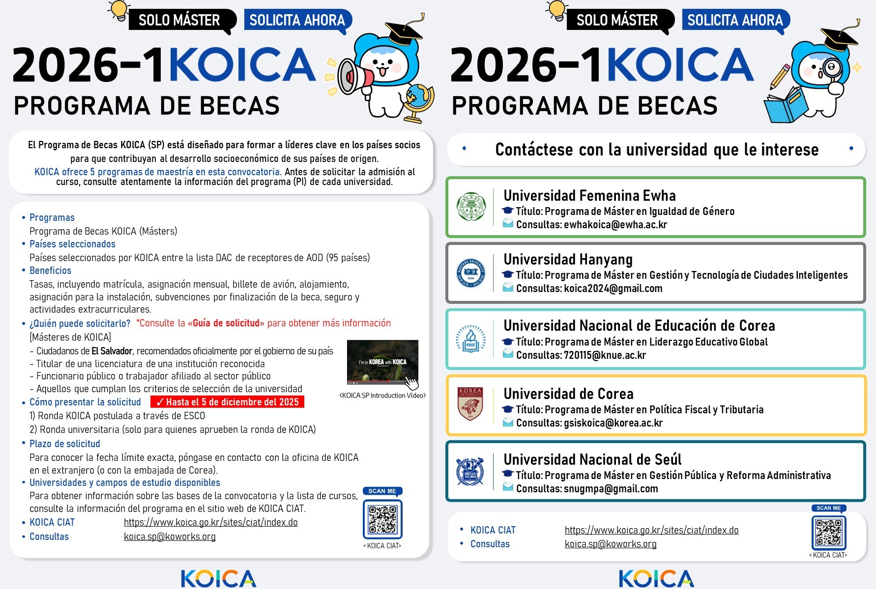 La Agencia de Cooperación Internacional de Corea (KOICA) abre convocatoria para su programa de becas de maestría totalmente financiadas en Corea del Sur, dirigidas a funcionarias y funcionarios públicos de países socios, como El Salvador. La beca cubre matrícula, pasajes aéreos, mensualidad, alojamiento, seguro médico y otros beneficios. ¿En qué…